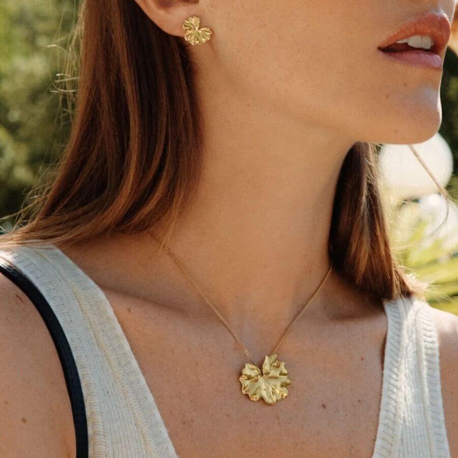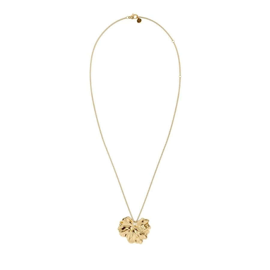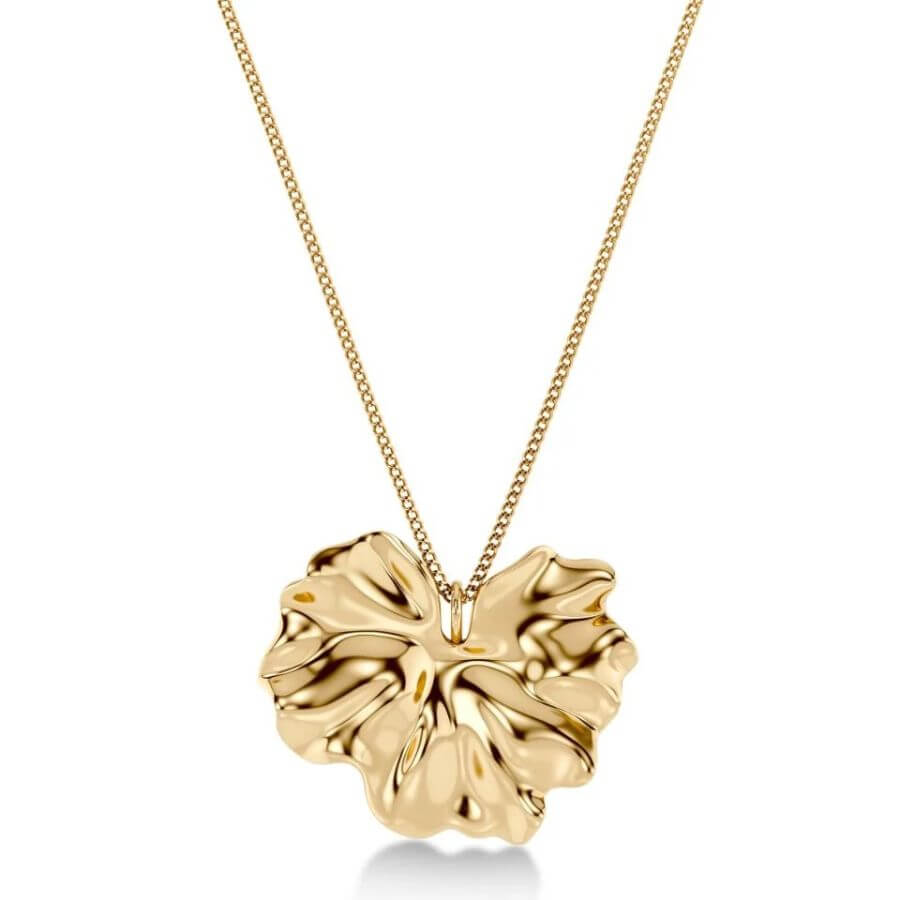 Edblad 130249 kuuluu Gerana-sarjaan, jossa inspiraationa ovat suuret, aaltoilevat kukan terälehdet. Tässä mallissa korostuu erityisesti kookas ja kauniisti muotoiltu kukkaelementti, jonka läpi ketju kulkee sulavasti. Riipuksen orgaaniset muodot ja pehmeät poimut heijastavat valoa elävästi, ja kiiltävä 14 karaatin kultaus antaa korulle lämpimän, viimeistellyn sävyn. Pidempi ketju tekee kokonaisuudesta näyttävän mutta tasapainoisen, ja koru asettuu kauniisti niin mekon kuin neuleenkin päälle.