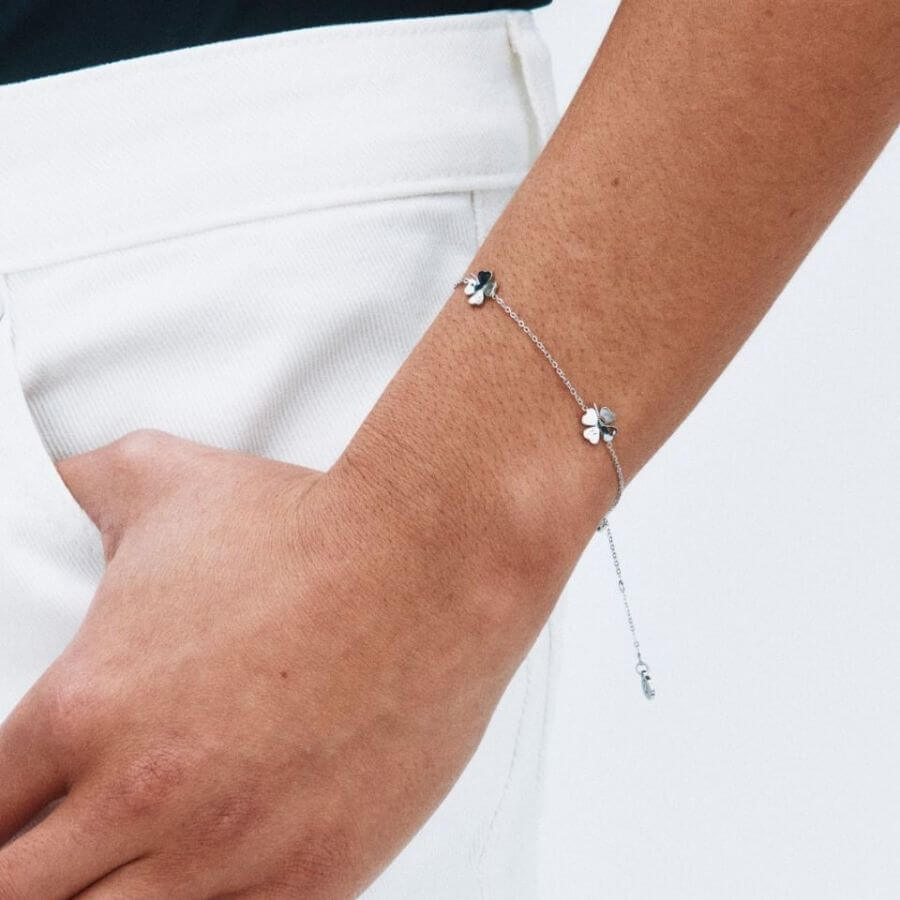 Edblad 130292 kuuluu Lucky Mini -sarjaan, joka on suositun Lucky-klassikon sirompi ja herkempi tulkinta. Tässä rannekorussa ohut, kiiltävä ketju on koristeltu viidellä tyylitellyllä neliapilalla, jotka on aseteltu tasapainoisesti ketjun varrelle. Hopeansävyinen pinta korostaa apiloiden pehmeitä muotoja ja luo raikkaan, harmonisen kokonaisuuden. Muotoilu on kevyt ja elegantti, minkä ansiosta rannekoru on helppo yhdistää eri tyyleihin.