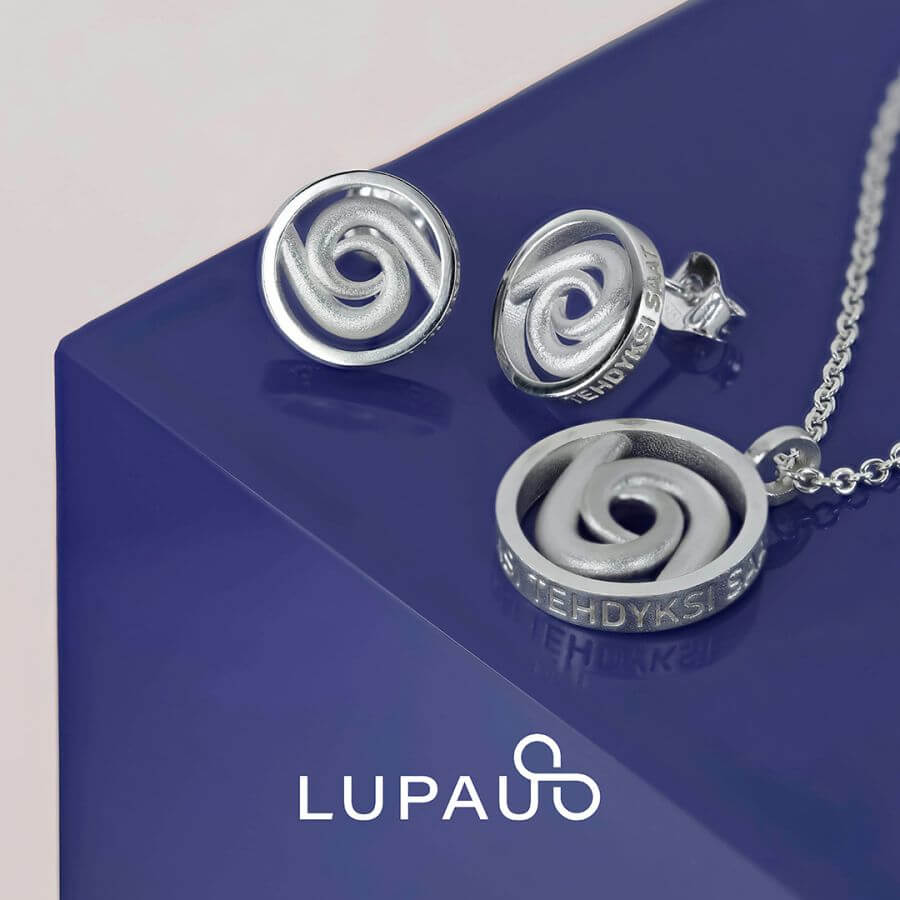 Lupaus 132-LUPAUS-1 korvakorut, suunnittelija Heli Kauhasen luomus, on valmistettu kierrätetystä hopeasta Hämeenlinnassa yhteistyössä Lotta Svärd Säätiön kanssa.