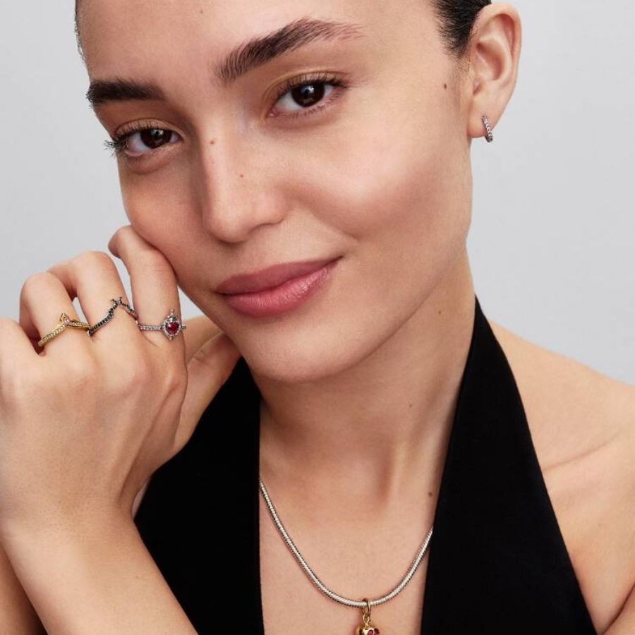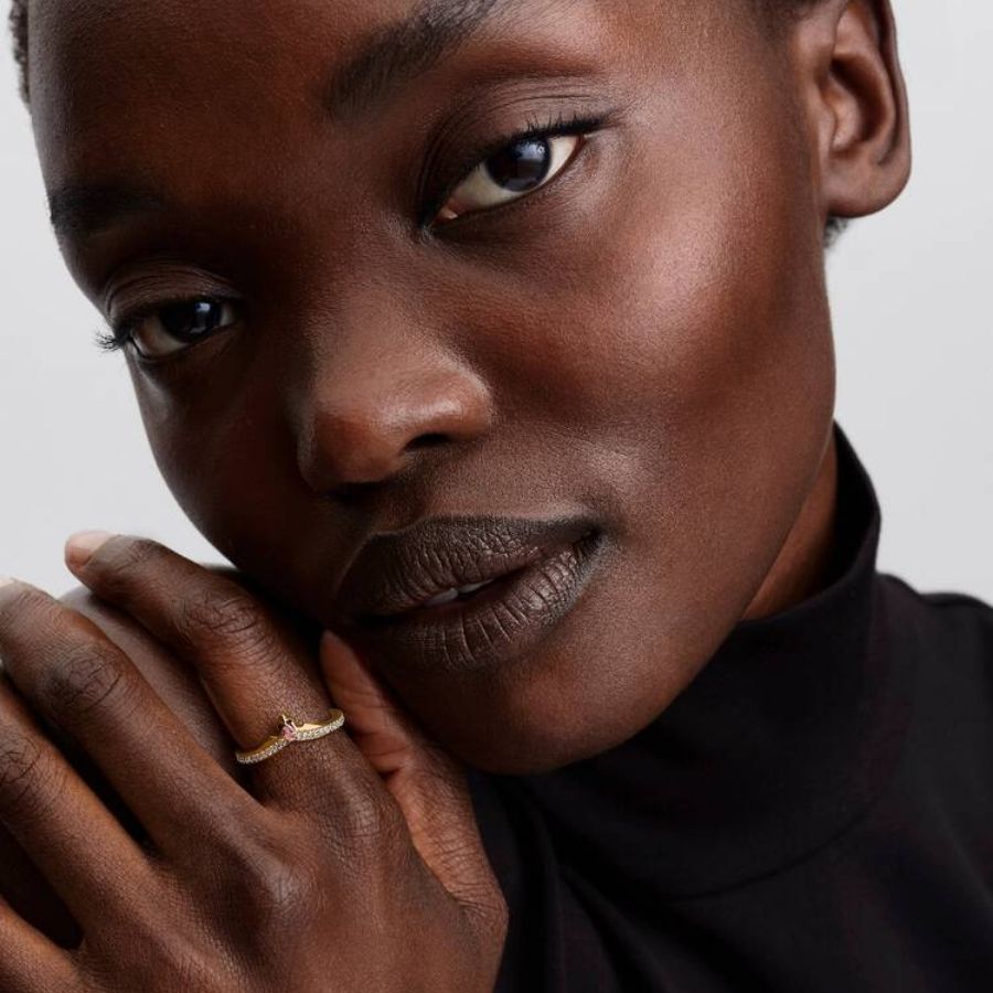 Pandora 164334C01 -sormuksessa yhdistyvät taidokas muotoilu ja säihkyvät yksityiskohdat. Sormuksen kultainen lämpö yhdistyy siroon, moderniin siluettiin, jota korostavat selkeästi rajatut linjat ja tarkasti istutetut kirkkaat zirkoniat. Etuosaa koristaa Misty Rose -sävyinen zirkonia, joka lisää koruun romanttista pehmeyttä ja valoisaa hehkua. Sävyjen ja muotojen tasapaino tekee sormuksesta erityisen hienostuneen sekä helposti yhdisteltävän muiden Pandora-korujen kanssa.