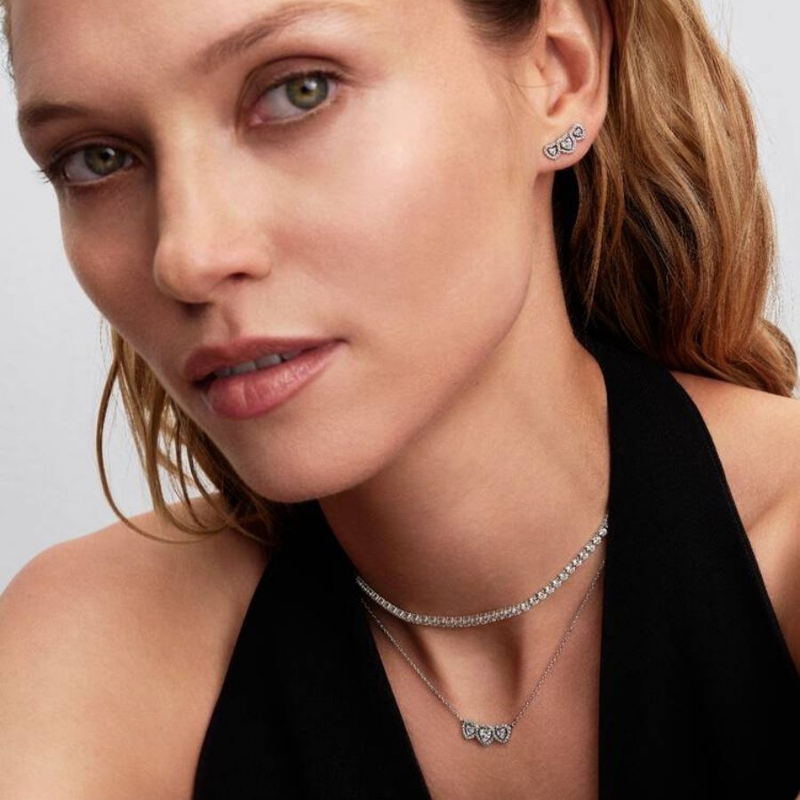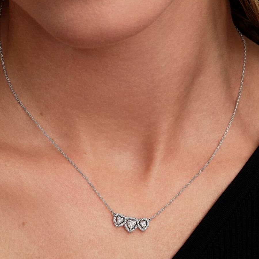 Pandora 394412C01-45 -kaulakorun keskiössä on kolme sydämenmuotoista kirkasta zirkoniaa, joista jokainen on kehystetty pienistä kivistä muodostuvalla sädekehällä. Tämä halo-tyyli voimistaa keskikivien säihkettä ja luo kauniin valoa heijastavan efektin. Sydämet on aseteltu vierekkäin luoden tasapainoisen ja siromuotoisen kokonaisuuden, joka asettuu kauniisti kaulalle. Sterling hopea runko tuo korulle puhtaan ja kirkkaan hehkun, joka täydentää kimaltavien kivien lumoa.