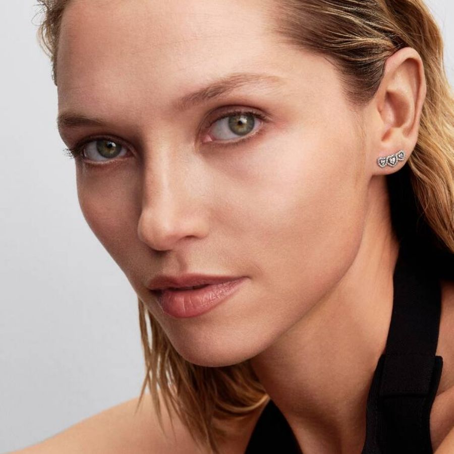 Pandora 294411C01 -korvakorut on valmistettu sterling hopeasta, joka antaa koruille kirkkaan ja ajattoman ilmeen. Jokainen sydän on koristeltu keskellä säihkyvällä kirkkaalla zirkonialla, jota ympäröi pienemmistä kivistä luotu sädekehä. Tämä halo-tyyli korostaa sydänten muotoa ja tekee korvakoruista erityisen valoa kauniisti heijastavat. Kolmen sydämen ketju luo korvakoruihin modernin ja elegantin ilmeen, joka mukailee korvalehden linjaa tyylikkäästi.